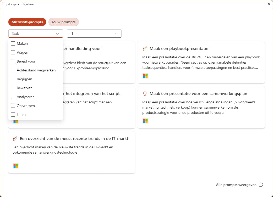 In de rubriek Microsoft-prompts vind je talrijke modelprompts, ingedeeld in categorieën als Maken, Vragen en Ontwerpen, en thematische secties zoals Marketing en IT.