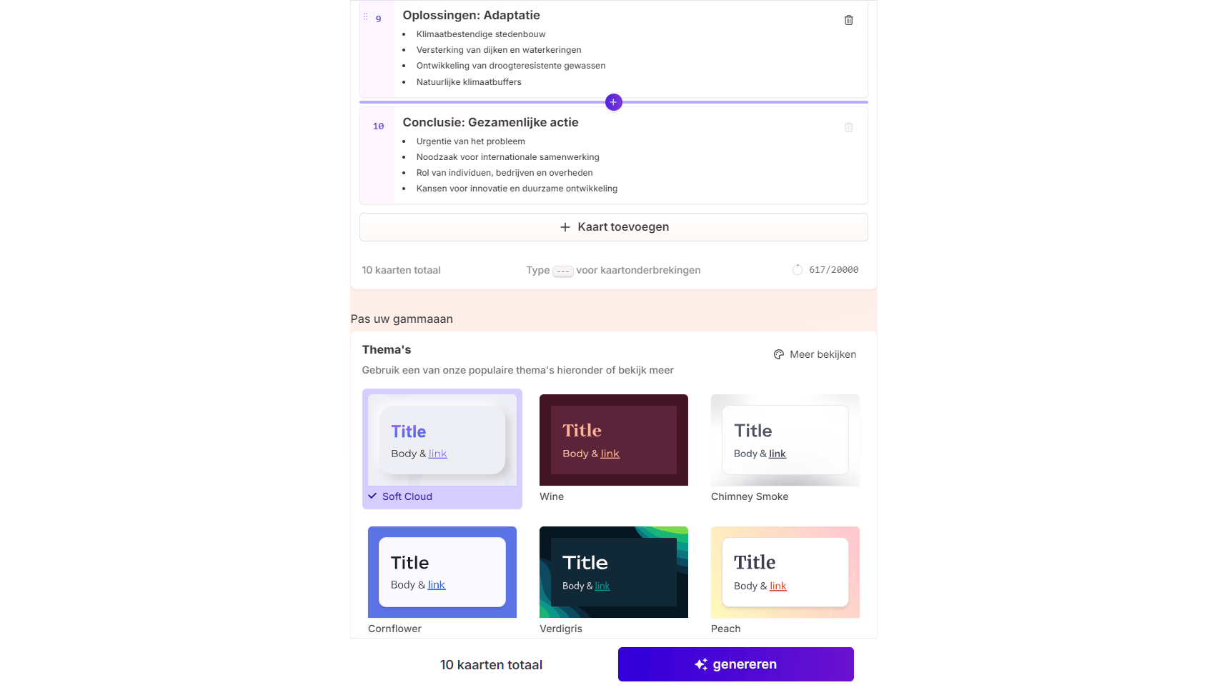 Geef aan dat het om een presentatie gaat, bepaal het aantal kaarten oftewel dia’s, met een maximum van tien in de gratis versie, en selecteer de taal. Vul je prompt in en bevestig met Overzicht genereren om een tekstueel dia-overzicht te krijgen. Je kunt direct een thema kiezen (klik ook op Meer bekijken) en bepalen hoeveel tekst er gemiddeld op de dia’s moet staan. Daarnaast kun je aangeven welke bronnen de tool mag gebruiken voor beelden, zoals Automatisch, AI-beelden (via een instelbare beeldgenerator) of Stockfoto’s (van Unsplash).
