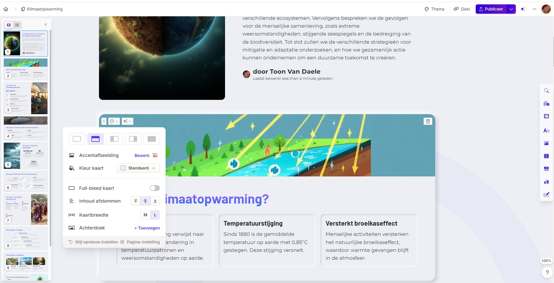 Vanuit je Gamma-dashboard kun je de gegenereerde dia’s op verschillende manieren bewerken. Wanneer je met de muisaanwijzer over een dia gaat, verschijnen knoppen voor het toevoegen van notities en het aanpassen van de stijl, zoals een andere accent- of achtergrondafbeelding, kleur en breedte. Via Bewerken met AI kun je de tekst langer of korter maken, opsplitsen, corrigeren, vereenvoudigen of vertalen.