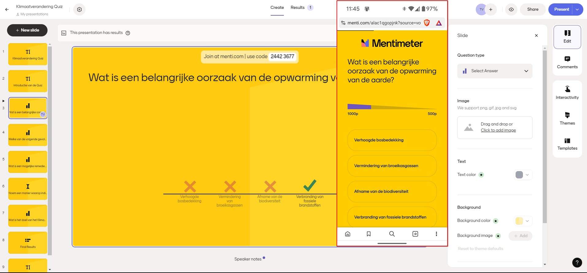- Voeg interactieve quizzen of polls toe aan je presentatie via Mentimeter