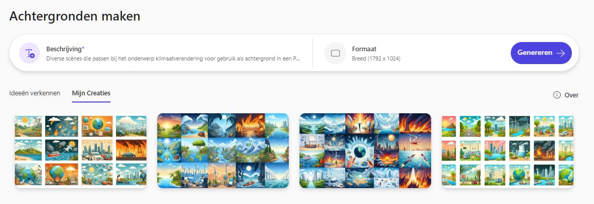 Meld je aan bij https://designer.microsoft.com, klik op Maken met AI en scrol door het visuele aanbod. Categorieën als Afbeeldingen, Pictogrammen en Achtergronden lijken ons het meest geschikt voor diapresentaties. Selecteer een categorie, kies indien nodig een formaat zoals Breed (1792 x 1024) en voer een gedetailleerde prompt in. Bevestig met Genereren.