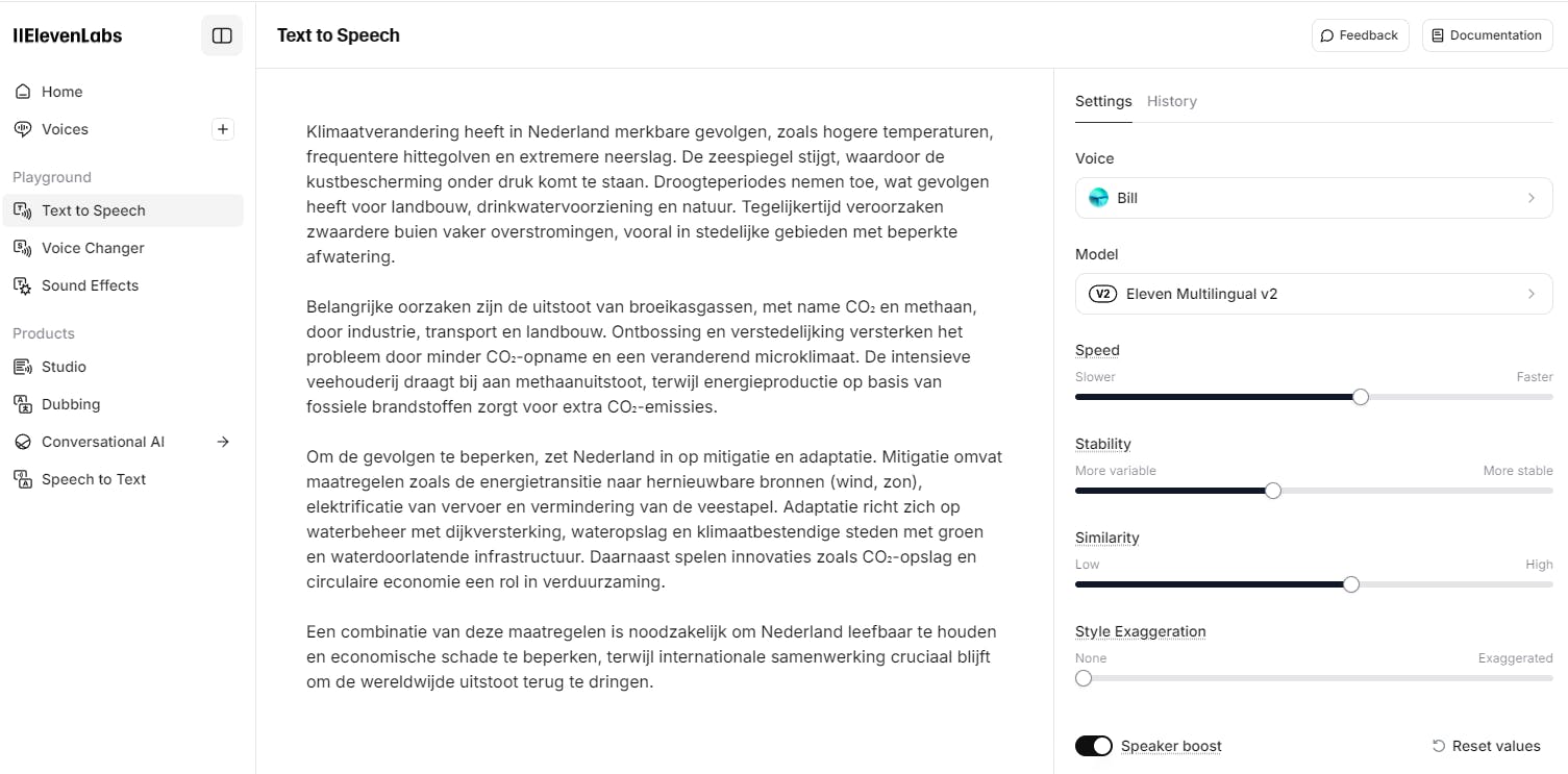 Een handige dienst om tekst naar spraak om te zetten is Elevenlabs. Maak eerst een account aan en kies Text to Speech. Plak of typ je tekst (tot 10.000 tekens in de gratis versie) en selecteer bij Settings een stem die ook in het Nederlands goed klinkt. Verder kun je hier ook het AI-model en enkele parameters instellen, zoals Speed en Stability. Klik vervolgens op Generate om de audio te beluisteren. Je kunt deze daarna downloaden als mp3-bestand.