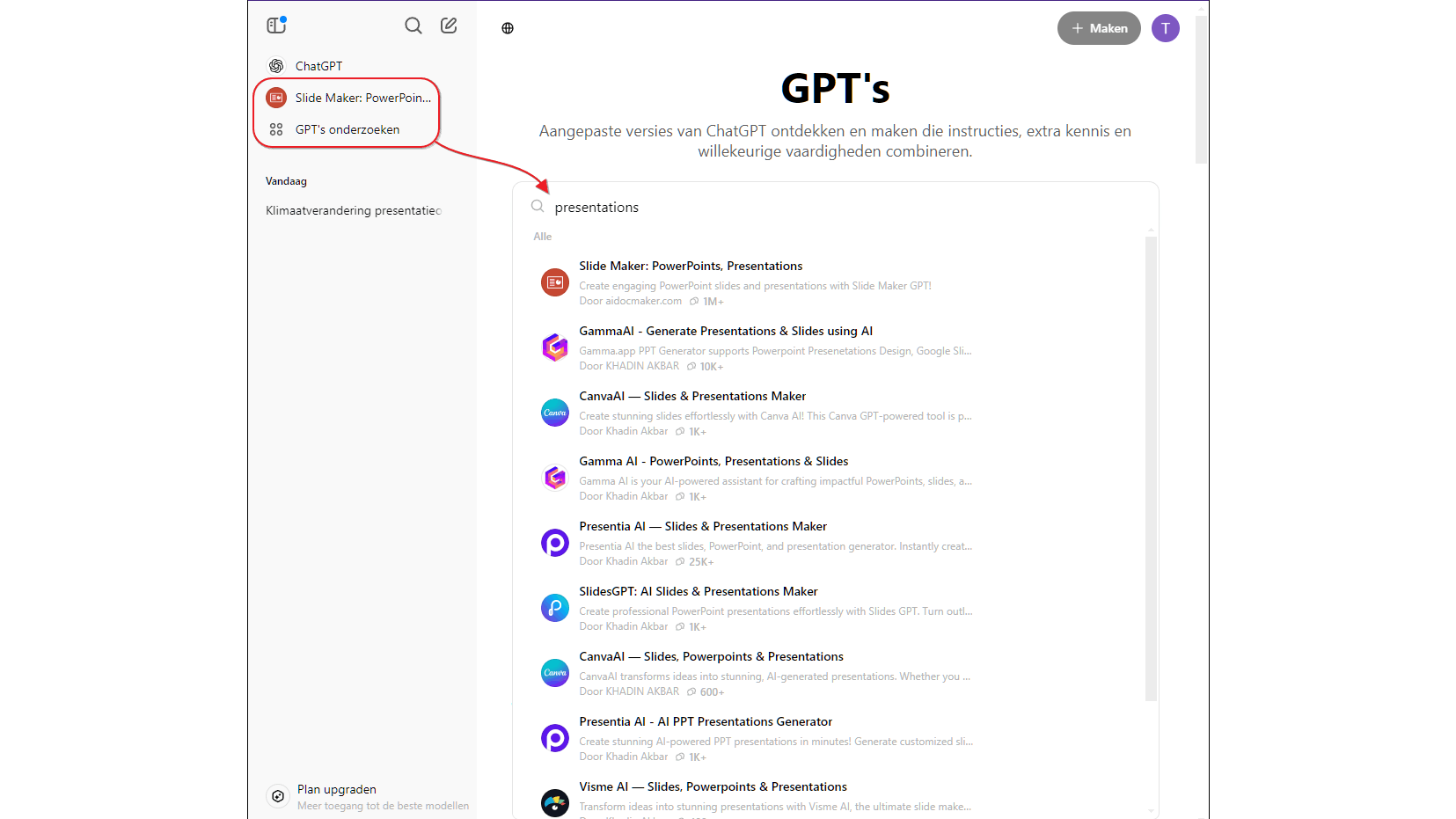 Webapplicaties als Gamma en vele andere kun je vaak ook op een alternatieve manier benaderen, namelijk via ChatGPT. Na je gratis aanmelding klik je op GPT’s onderzoeken. Zo’n GPT is een AI-model dat voor specifieke taken is geoptimaliseerd. Voer hier een trefwoord, zoals presentations, in de zoekbalk in. De term presentaties kan ook, maar weet dat Nederlandstalige termen vaak naar andere tools leiden. Eventueel klik je op Meer zien. Je krijgt nu een overzicht van AI-tools waarmee je in veel gevallen presentaties kunt genereren op basis van prompts. Bij de meeste moet je toestemming geven om via een connector verbinding te maken, meestal in de vorm van een webapplicatie. Een mogelijke kwaliteitsindicatie is het aantal gebruikers. In de top drie bijvoorbeeld vonden wij Slide Maker, GammaAI en CanvaAI.