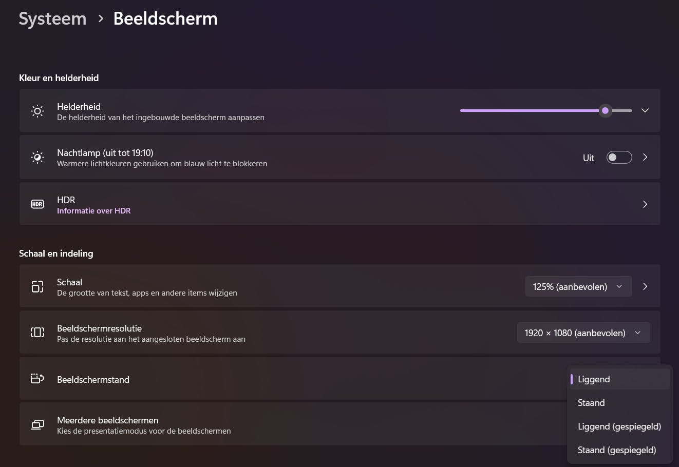 Open de app Instellingen met Windows-toets+I en kies Systeem. Aan de rechterkant klik je op de pagina Beeldscherm. Daarna klik je onder de instellingen Schaal en indeling op de instelling Beeldschermstand. Daar kun je de volgende instellingen vastleggen: Liggend (standaardconfiguratie), Staand (draait het scherm 90 graden links), Liggend gespiegeld (ondersteboven) en Staand gespiegeld (draait het scherm 90 graden rechtsom). Je kunt ook sneltoetsen gebruiken om het scherm te roteren. Met Ctrl+Alt+Pijl-omhoog ga je naar de liggende modus. Ctrl+Alt+Pijl-omlaag draait het scherm ondersteboven. Ctrl+Alt+Pijl-rechts roteert het scherm 90 graden. Ctrl+Alt+Pijl-links draait het scherm 90 graden naar links.