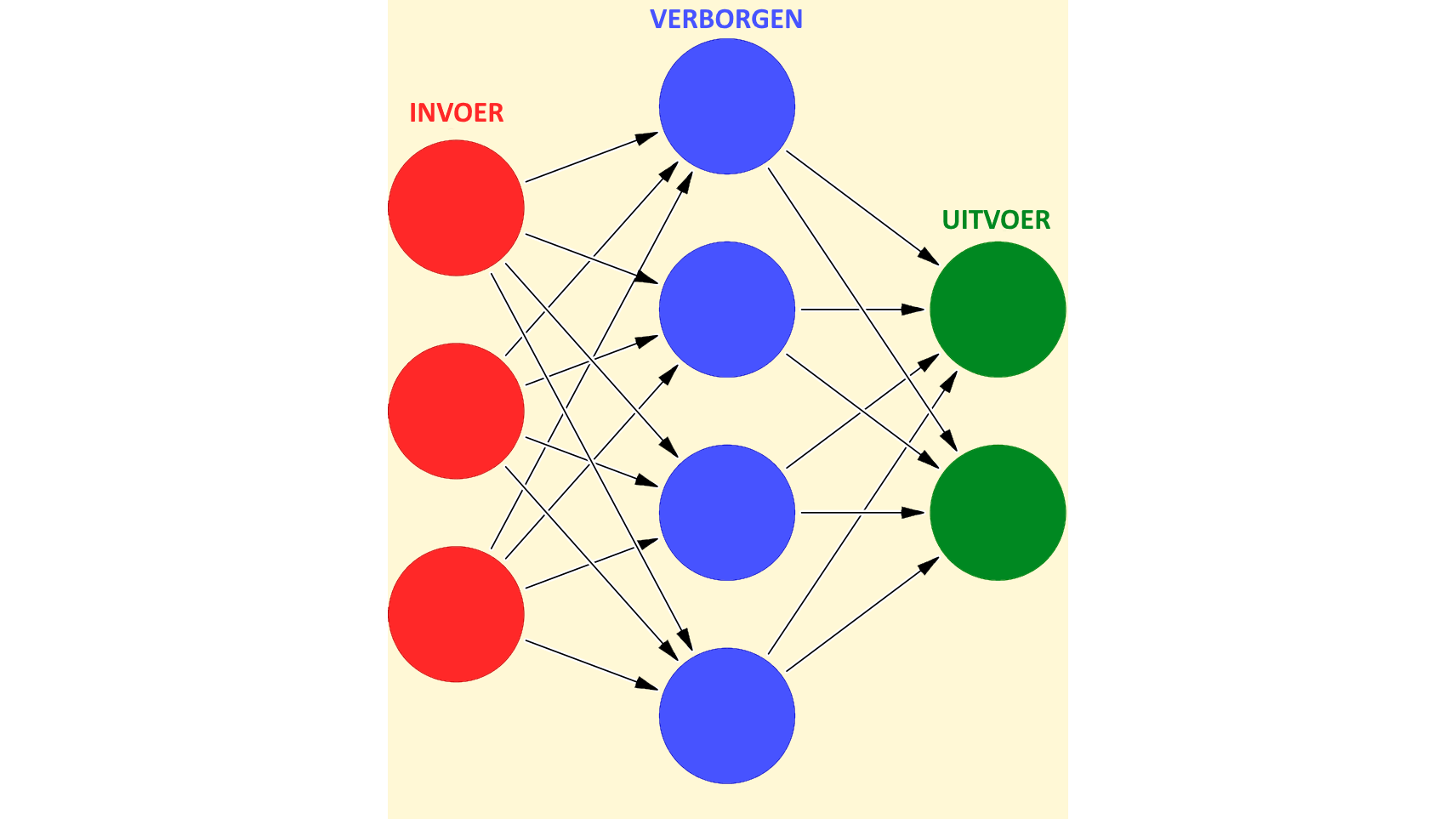 De informatie stroomt door een of meer verborgen lagen tussen de invoer- en uitvoerlaag. Elke verborgen laag verwerkt de gegevens verder, waardoor complexere patronen worden herkend. Hiervoor gebruikt elk neuron een zogeheten activatiefunctie, die bepaalt of en in welke mate de uitvoer wordt doorgegeven. Zonder activatiefuncties zou het netwerk alleen eenvoudige wiskundige verbanden leren, zoals rechte lijnen, terwijl het nu ook met complexe, gebogen of gelaagde patronen overweg kan.