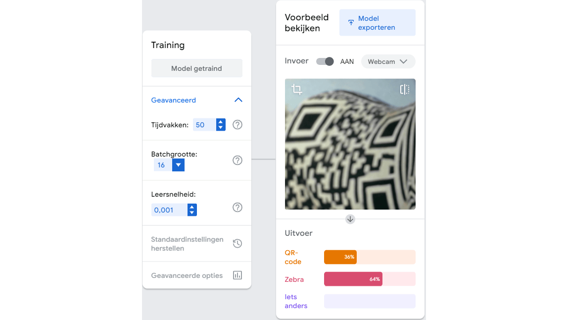 Klik rechts op Voorbeeld bekijken, zet Invoer op AAN en kies of je via Webcam of Bestand data wilt aanleveren. Wij kozen voor Webcam en testten met verschillende afbeeldingen van QR-codes en zebra’s. Bij Uitvoer toont Teachable Machine een percentage dat de zekerheid van de classificatie weergeeft.