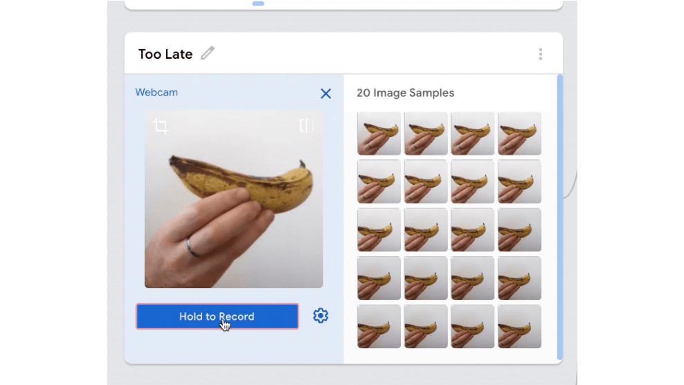 Daarna voeg je data toe aan elke klasse via de knop Uploaden of Webcam. Bij gebruik van de webcam moet je de pagina toegang geven tot de aangekoppelde camera. Door op Ingedrukt houden om op te nemen te klikken, stuur je continu snapshots naar Teachable Machine. De afbeeldingen verschijnen vervolgens in de betreffende klasse.