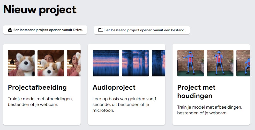 Surf naar https://teachablemachine.withgoogle.com. Hier leer je een computer trainen om je eigen afbeeldingen, geluiden en houdingen te herkennen. Klik op Aan de slag om een nieuw project te starten en kies uit drie modelopties: Projectafbeelding, Audioproject of Project met houdingen.