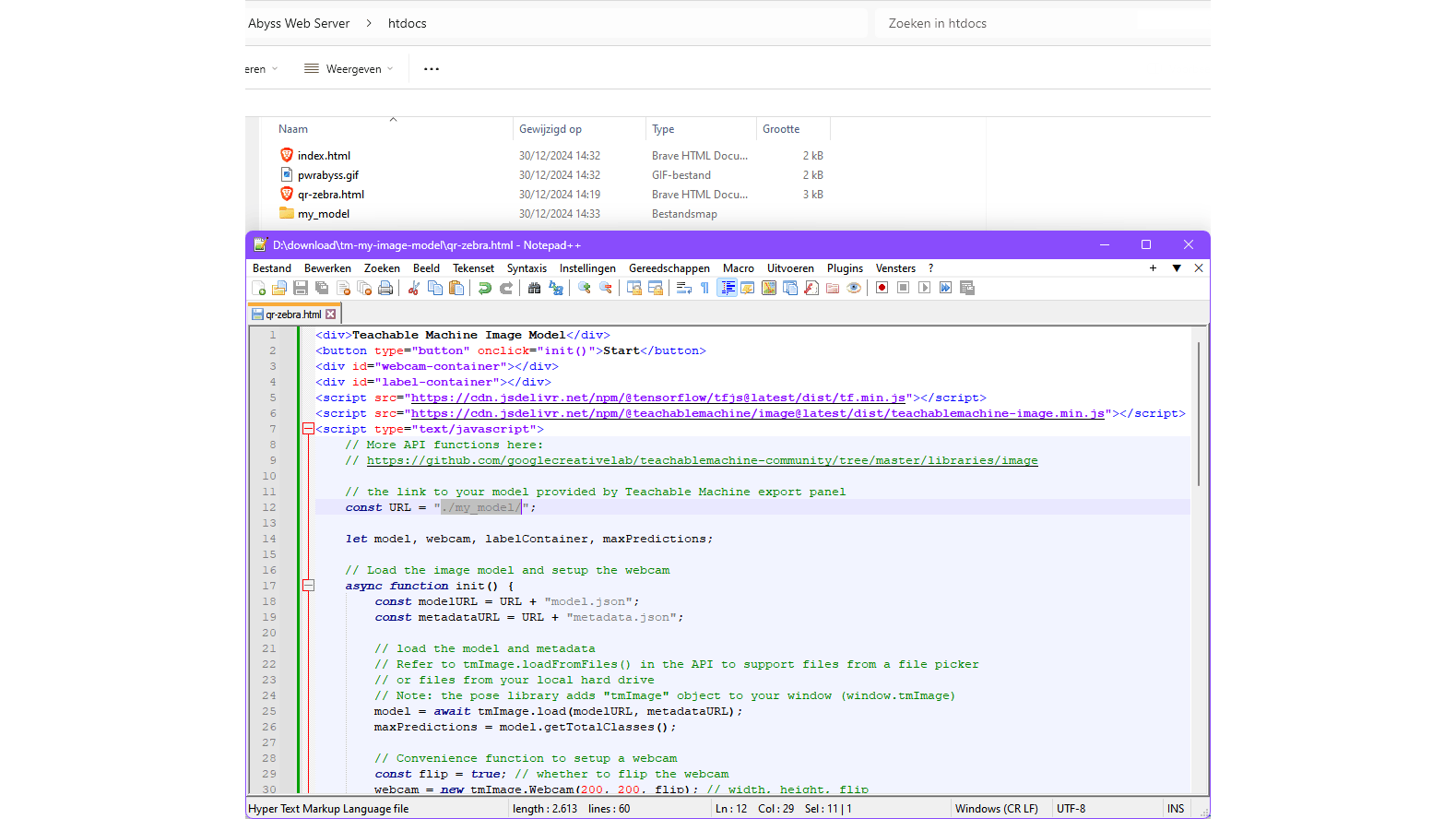 Om lokaal te kunnen testen zonder browserfoutmeldingen zet je eerst een eenvoudige webserver op. Wij gebruikten de gratis Abyss Web Server (voor Windows, macOS en Linux). Plaats het html-bestand samen met de submap \my_model in de standaardmap C:\Abyss Web Server\htdocs. Dubbelklik erop om het in je browser te starten. Als het goed is, kun je nu meteen je AI-model testen. Succes.