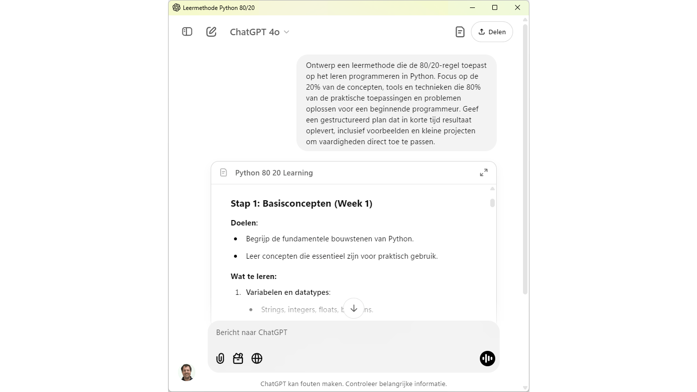Ook om de basisbeginselen te leren is AI nuttig. Pas bijvoorbeeld de Pareto-methode toe. Die methode stelt dat 80 procent van de resultaten voortkomt uit 20 procent van de inspanningen. Vraag de chatbot om een plan te maken dat deze regel toepast op het leren programmeren van bijvoorbeeld Python, door te focussen op 20 procent van de concepten, tools en technieken die 80 procent van de praktische toepassingen en problemen oplossen voor een beginnende programmeur. Vraag om een gestructureerd plan dat in korte tijd resultaat oplevert, inclusief voorbeelden en kleine projecten om vaardigheden direct toe te passen.