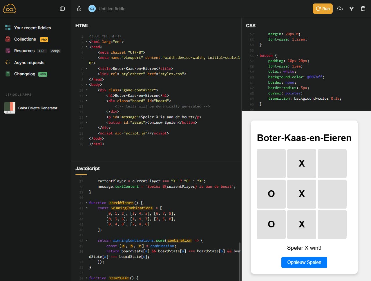 ChatGPT genereert de gevraagde code. Je kunt individueel de HTML, CSS en JavaScript kopiëren. Om het te proberen, kun je alles plakken op websites als www.jsfiddle.net en www.codepen.io. Voor dit voorbeeld hebben we bij JSFiddle een projectpagina aangemaakt. We gaan dit voorbeeld in de volgende stappen verder verbeteren, steeds met links naar de verbeterde versie.
