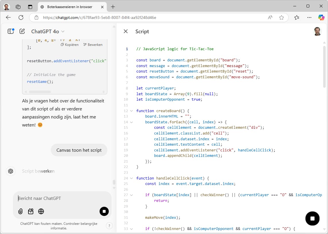 We beginnen met een eenvoudig voorbeeld en vragen aan ChatGPT om een spelletje boter-kaas-en-eieren te maken, ook wel bekend als tic-tac-toe. Hoewel het Engels soms betere resultaten kan geven, werken we voor dit artikel volledig in het Nederlands. We starten met deze prompt: “Maak een volledig functionele boter-kaas-en-eieren voor in een browser. Maak de HTML-structuur, voeg CSS-stijlen toe en implementeer de JavaScript-logica. Maak een scheiding tussen HTML, CSS en JavaScript. Zorg dat het programma responsief is zodat het bij elke schermgrootte werkt.”