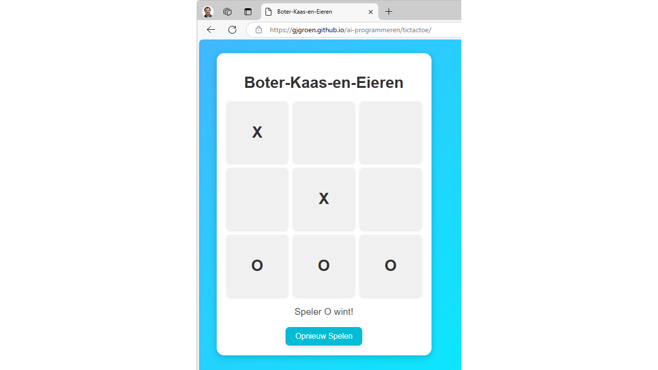 We vragen ChatGPT vervolgens om een slimme computertegenstander toe te voegen, waarbij aan het begin van het spel wordt gekozen wie er mag beginnen. Via deze webpagina kun je deze versie zien. De computertegenstander blijkt in eerste instantie overigens helemaal niet zo slim, waardoor je makkelijk je potjes wint. Maar dat is snel opgelost. Na ons verzoek om de computertegenstander slimmer te maken, controleert het programma voortaan eerst op mogelijke winnende zetten en blokkeert het de tegenstander indien nodig. Als er geen direct winnende of blokkerende zetten zijn, kiest het een willekeurige lege cel. Deze slimmere versie kun je hier bekijken.