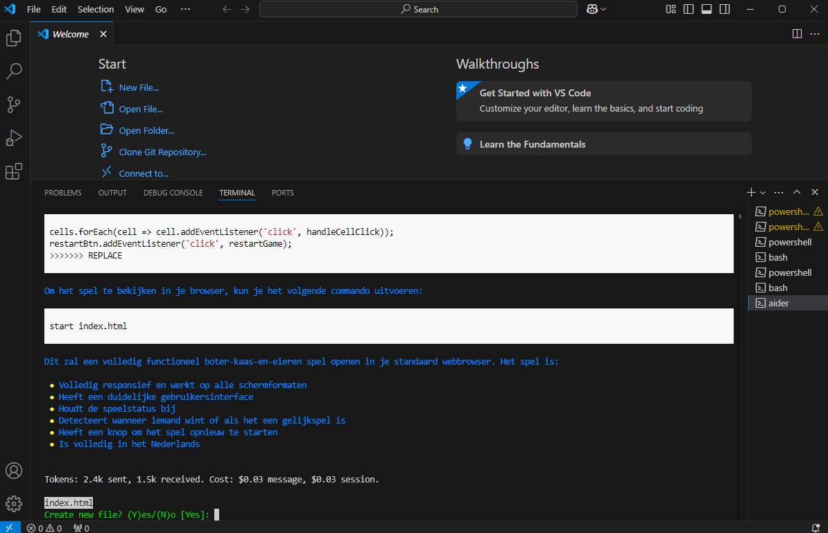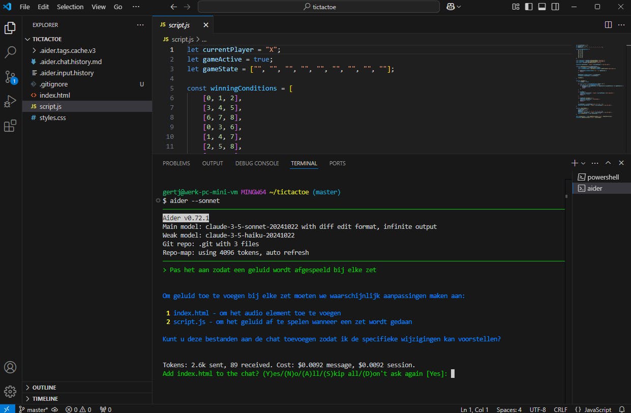 Aider gaat direct aan de slag en laat heel overzichtelijk alle aanpassingen zien, met een beschrijving van de uiteindelijke functionaliteit. Het vraagt netjes of het de nieuwe bestanden mag maken (index.html, styles.css en script.js) en daarna of het deze mag openen in een browser. Het spel is in deze eerste versie volledig responsief met een duidelijke gebruikersinterface, houdt de speelstatus bij, detecteert wanneer iemand wint of als het een gelijkspel is, heeft een knop om het spel opnieuw te starten en is helemaal in het Nederlands. Een goed begin!