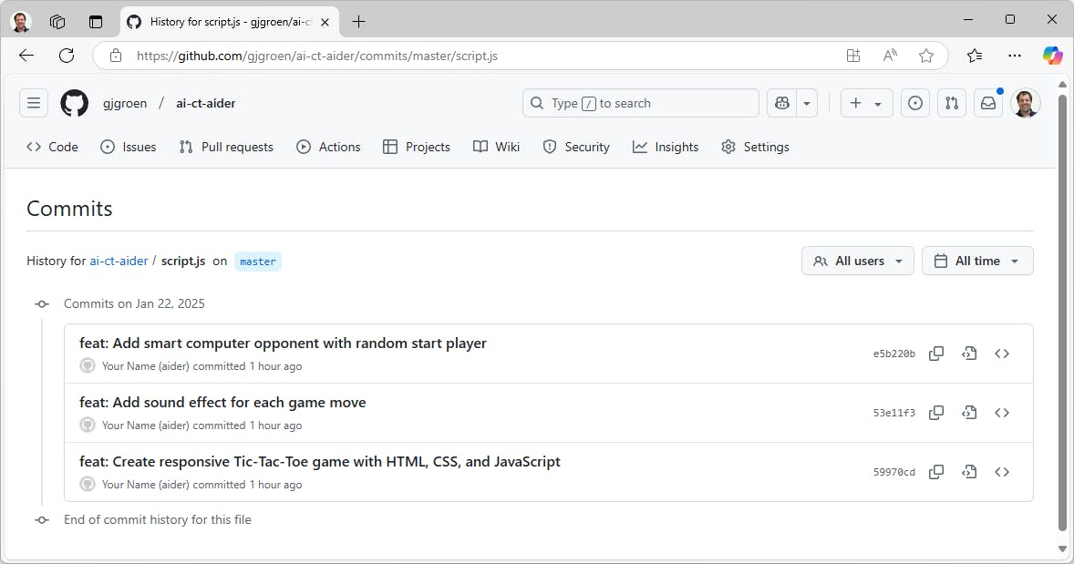 Nu zie je de commit-geschiedenis van het geselecteerde bestand. Door op een specifieke commit te klikken, kun je de aangebrachte wijzigingen bekijken. Binnen Aider zijn er ook nog wat trucjes. Zo kun je met /diff zien wat de laatste veranderingen zijn. Met /undo kun je die eenvoudig ongedaan maken.