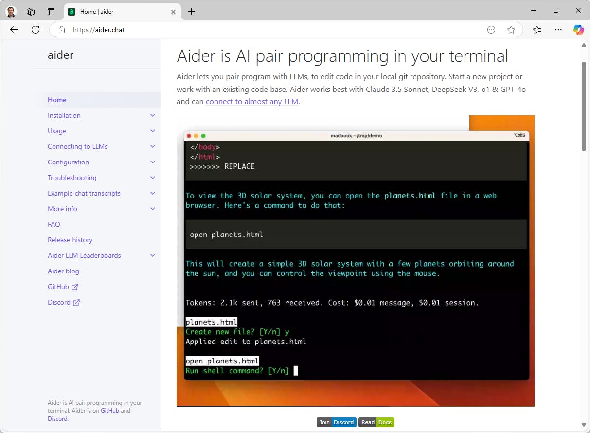 Aider is opensource en werkt met heel veel LLM’s samen. Hier gebruiken we de API voor Claude 3.5 Sonnet, maar je kunt ook de API van OpenAI gebruiken of een LLM die je zelf lokaal draait of elders, zoals via OpenRouter. De integratie met Git is enorm praktisch. Voor elke aangebrachte wijziging voert het een ‘commit’ uit, voorzien van een duidelijke omschrijving, zodat je achteraf een goed overzicht met alle veranderingen hebt en ook stapjes terug kunt doen. Niet alle alternatieven bieden dit en dat is vooral een gemis als er iets fout gaat en je geen idee meer hebt hoe je dat moet oplossen.