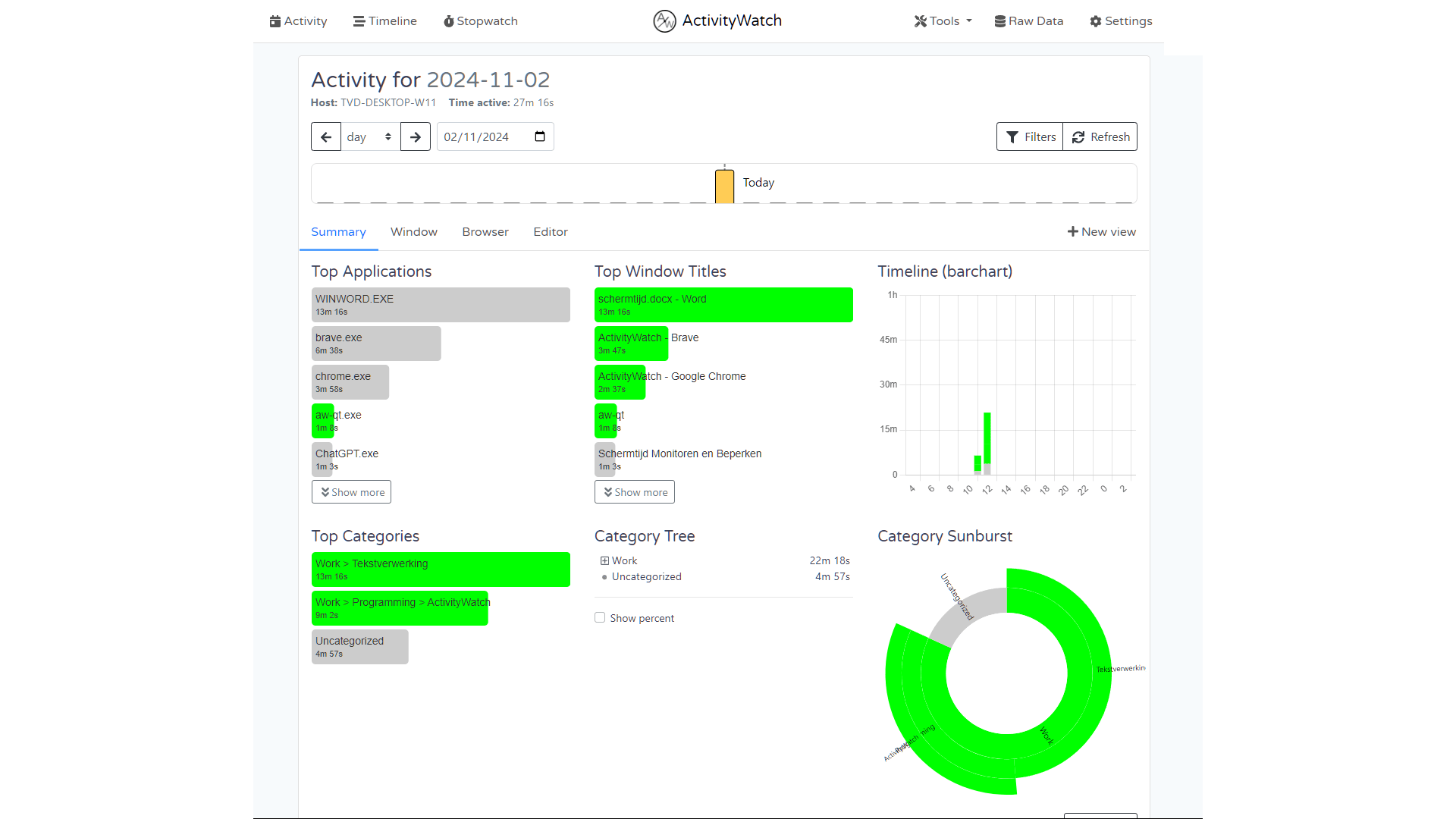 Een krachtige, gratis opensource-tool om bij te houden hoeveel tijd je aan applicaties besteedt, is ActivityWatch, beschikbaar voor Windows, macOS, Linux en Android. Na installatie draait er een webserver waarmee je het dashboard kunt openen via http://localhost:5600. Klik bovenaan op Activity en vervolgens op Summary voor een overzicht van de gebruikte applicaties en geopende vensters. Je kunt de tijdsperiode afbakenen en filters instellen, bijvoorbeeld voor zelf gedefinieerde categorieën in Settings. Om te zien hoeveel tijd je op websites doorbrengt, installeer je de browserplug-in ActivityWatch web Watcher, te vinden in de Chrome- en Firefox-webstores. Deze plug-in toont de bezochte sites op het Activity / Browser-tabblad van je dashboard.