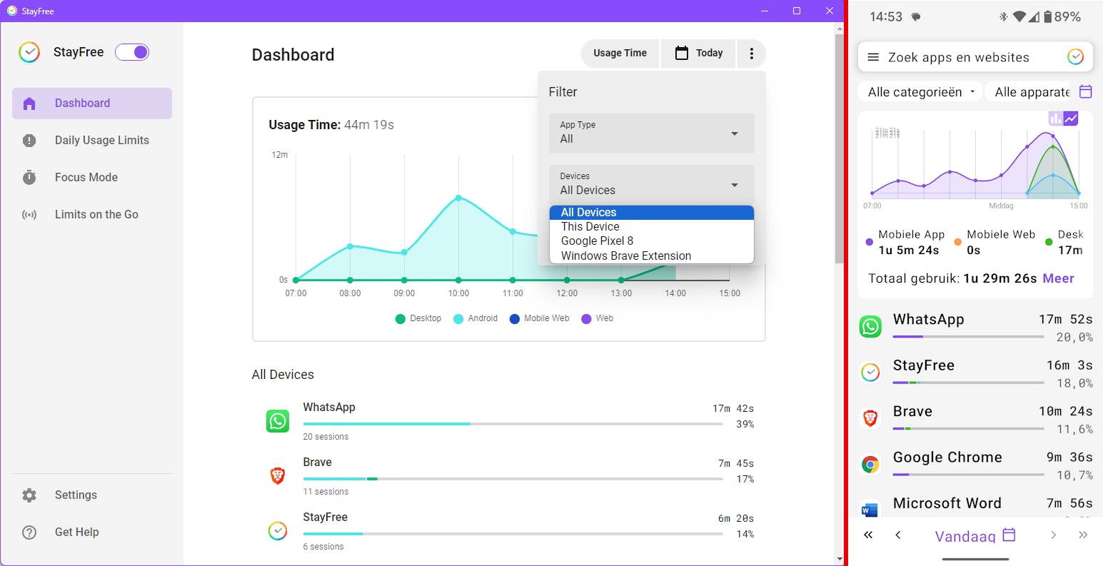 Met StayFree kun je je schermtijd op diverse apparaten vanuit een dashboard beheren (links: Windows; rechts: Android).