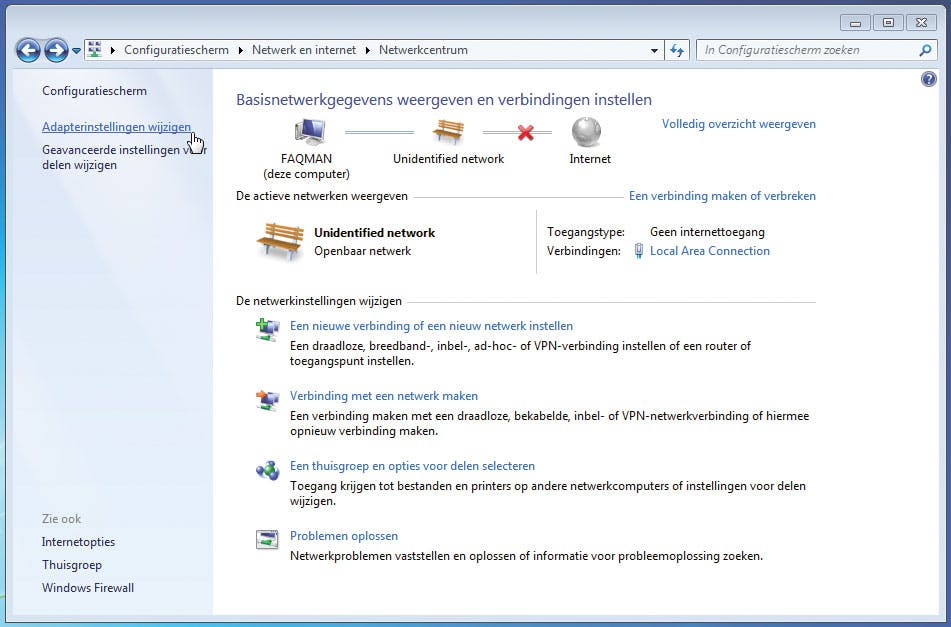 Op de oude XP-pc is een Windows Verkenner-venster geopend waarmee we de usbstick en Windows Easy Transfer al snel hebben gevonden. Op de getoonde snelkoppeling kunt u dubbelklikken om daarmee de kopie van Windows Easy Transfer te starten. Het eerste exemplaar van Windows Easy Transfer draait reeds op de nieuwe pc. (Zie afbeelding) We gaan Windows Easy Transfer via het netwerk gebruiken. Er moet dus een netwerkkoppeling worden gemaakt tussen de oude en de nieuwe pc. We gaan daar zo’n kruiskabel (voor een paar euro te koop in de computerwinkel) voor gebruiken; vraag dan naar een netwerk-kruiskabel die een lengte heeft van, pak hem beet, anderhalve meter. Even een netwerk-intermezzo! We moeten ervoor zorgen dat de beide computers kunnen communiceren via de kruiskabel die u in de ethernetpoorten heeft gestoken, te beginnen met de Windows 7-pc. Ga via het Configuratiescherm naar het Netwerkcentrum en klik links in beeld op de taak Adapterinstellingen wijzigen. (Zie afbeelding)