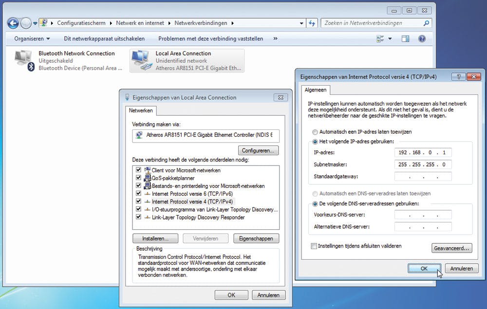 De adapterinstellingen die u gaat wijzigen, zijn de instellingen van de ethernetkaart waarop de kruiskabel is aangesloten. Het is de bedoeling dat u de tcp/ip-eigenschappen gaat aanpassen door handmatig een ip-adres toe te kennen. Kies voor 192.168.0.1 en het subnetmasker 255.255.255.0. (Zie afbeelding)