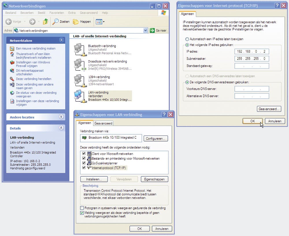 Vervolgens doet u iets soortgelijks op de oude pc. In geval van Windows XP gaat u naar het venster Netwerkverbindingen toe. Ook daar gaat u aan het werk met de netwerkkaart waarin de kruiskabel is gestoken en moet u de tcp/ip-eigenschappen aanpassen. Alleen is het handmatig ingestelde ipadres een ietsje anders: 192.168.0.2. Alleen het laatste getal verschilt! Het subnetmasker stelt u hier ook in op 255.255.255.0. (Zie afbeelding)