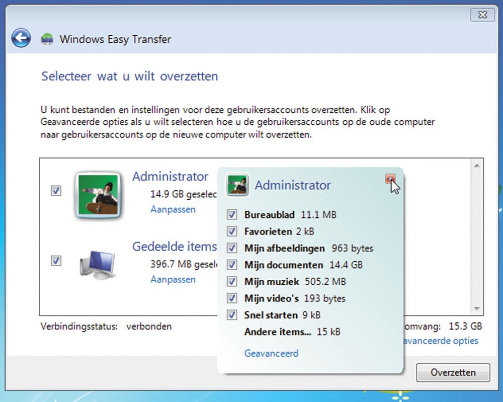 Het dialoogvenster Geavanceerde opties gebruikt u om aan te geven welke gegevens van welke gebruiker op de oude pc moeten worden overgezet naar welke gebruiker op de nieuwe pc. Waarmee direct duidelijk is geworden dat u niet zomaar met het overzetten van bestanden en instellingen moet beginnen. Dit is trouwens ook een mooi moment om nog even na te denken over het account zoals dat actief is op de nieuwe Windows 7-pc. Mogelijk wilt u toch nog een andere accountnaam instellen? (Zie afbeelding) Pal voordat we met het overzetten van de bestanden en de instellingen beginnen, kijken we toch nog even naar hetgeen zal worden getransporteerd door Windows Easy Transfer. (Zie afbeelding)