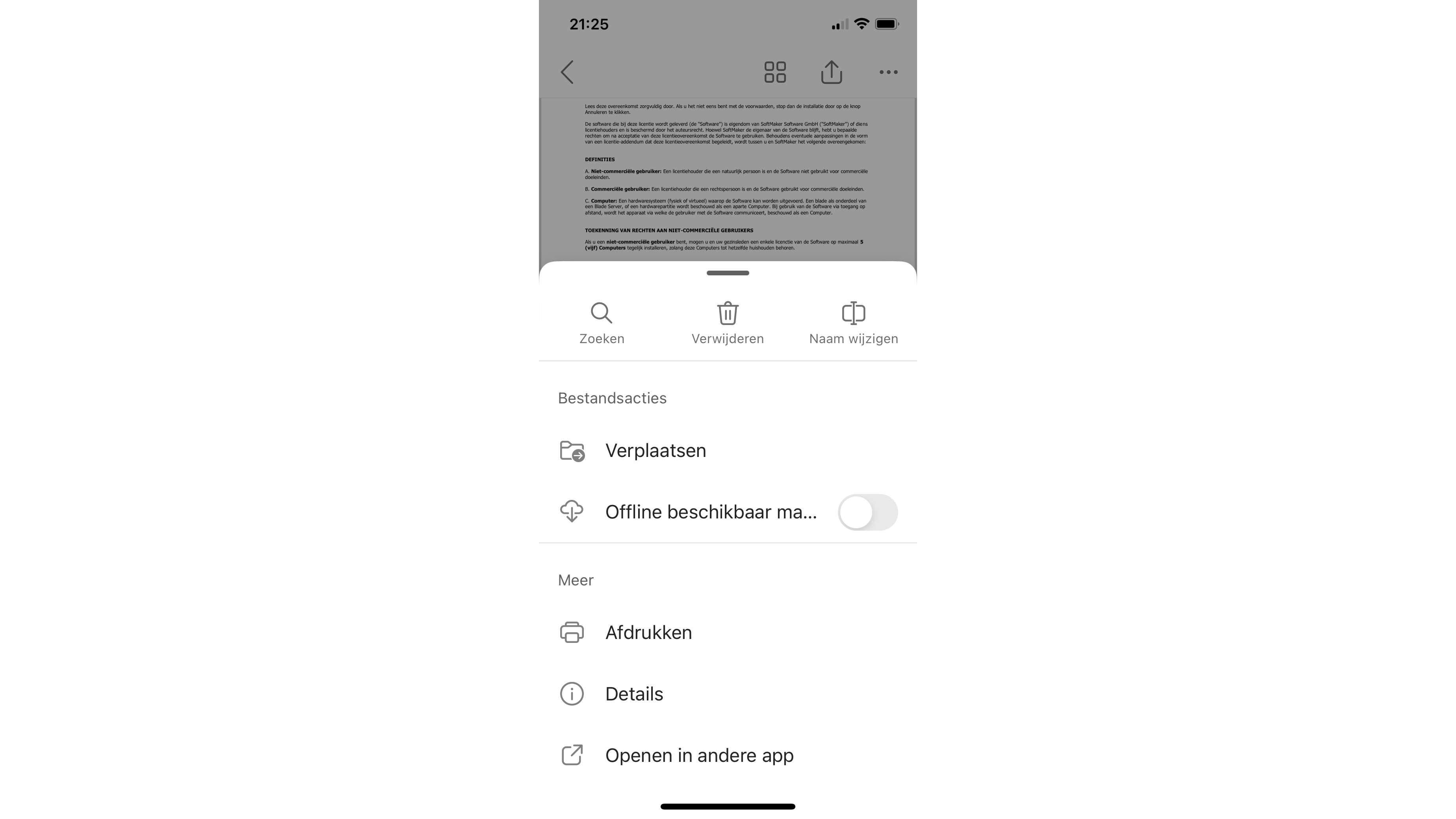 Je kunt het bestand verplaatsen, offline beschikbaar maken of afdrukken. Daarnaast kun je de bestandsnaam wijzigen, de details van het bestand opvragen of het openen in een andere app. Als je de benodigde Office-apps nog niet op je mobiele apparaat hebt geïnstalleerd, verschijnt er een scherm met de vraag of je de app wilt downloaden om het document te bewerken.