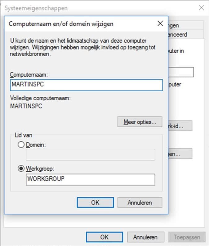 Je zou verwachten dat er naast de naam van je computer een knop zou staan waarmee je die naam kon bewerken. Opmerkelijk genoeg heeft Microsoft ervoor gekozen om die knop helemaal onderaan in het venster te plaatsen. Klik op Wijzigen, waarna er een klein venster verschijnt waarin je de computernaam kunt aanpassen. Let op: je kunt nagenoeg geen leestekens gebruiken en spaties zijn ook niet toegestaan. Wanneer je de naam van je computer hebt gewijzigd, klik je op OK. Je dient wel je pc opnieuw op te starten voordat de wijziging zichtbaar is.