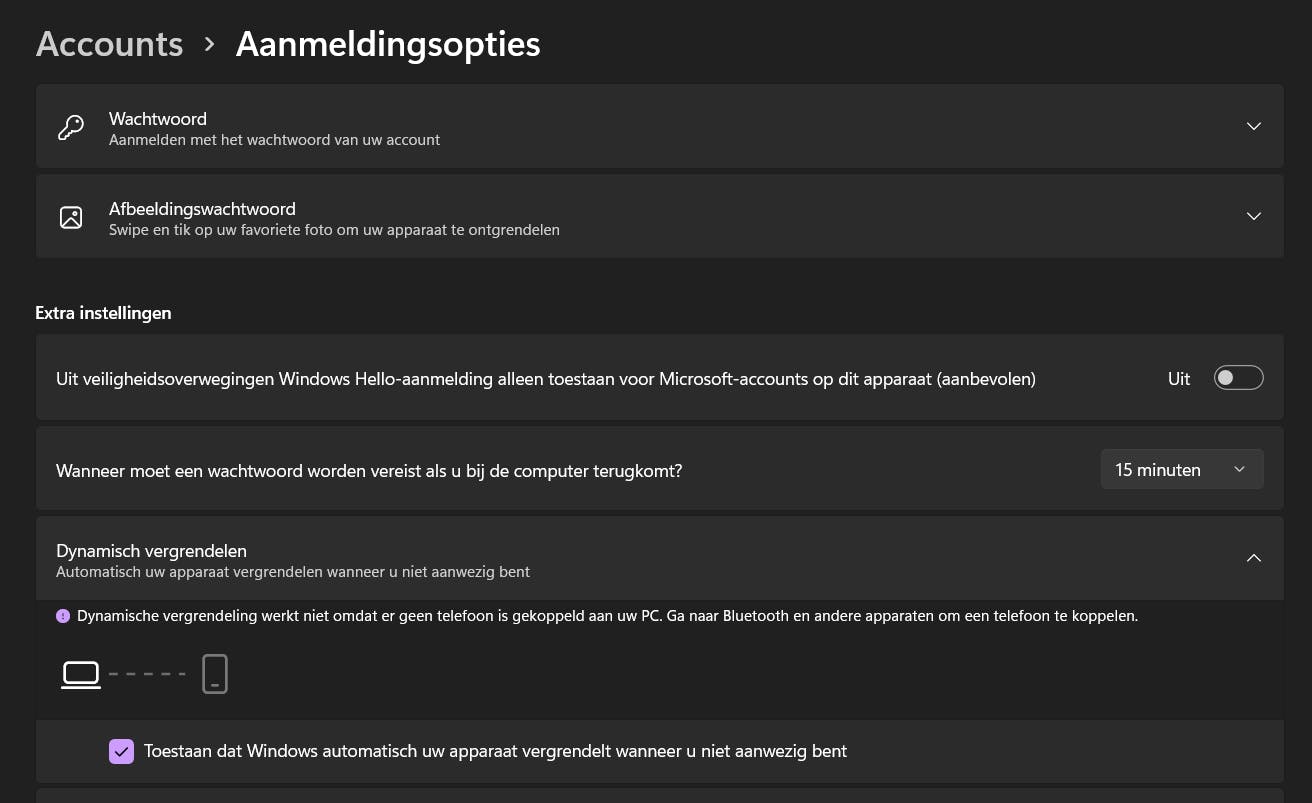 Voor vergeetachtige gebruikers is er de Dynamische vergrendeling, een automatische beveiliging gebaseerd op bluetooth. Deze functie is beschikbaar in Windows 10 en 11. Het enige wat je nodig hebt, is een pc die uitgerust is met bluetooth en een Android-telefoon of iPhone met bluetooth. Dynamische vergrendeling koppelt via bluetooth je pc met je telefoon. Wanneer je met de telefoon op zak weggaat, zal het bluetooth-signaal verzwakken en wegvallen. Als Windows dit detecteert, zal het de pc vergrendelen.