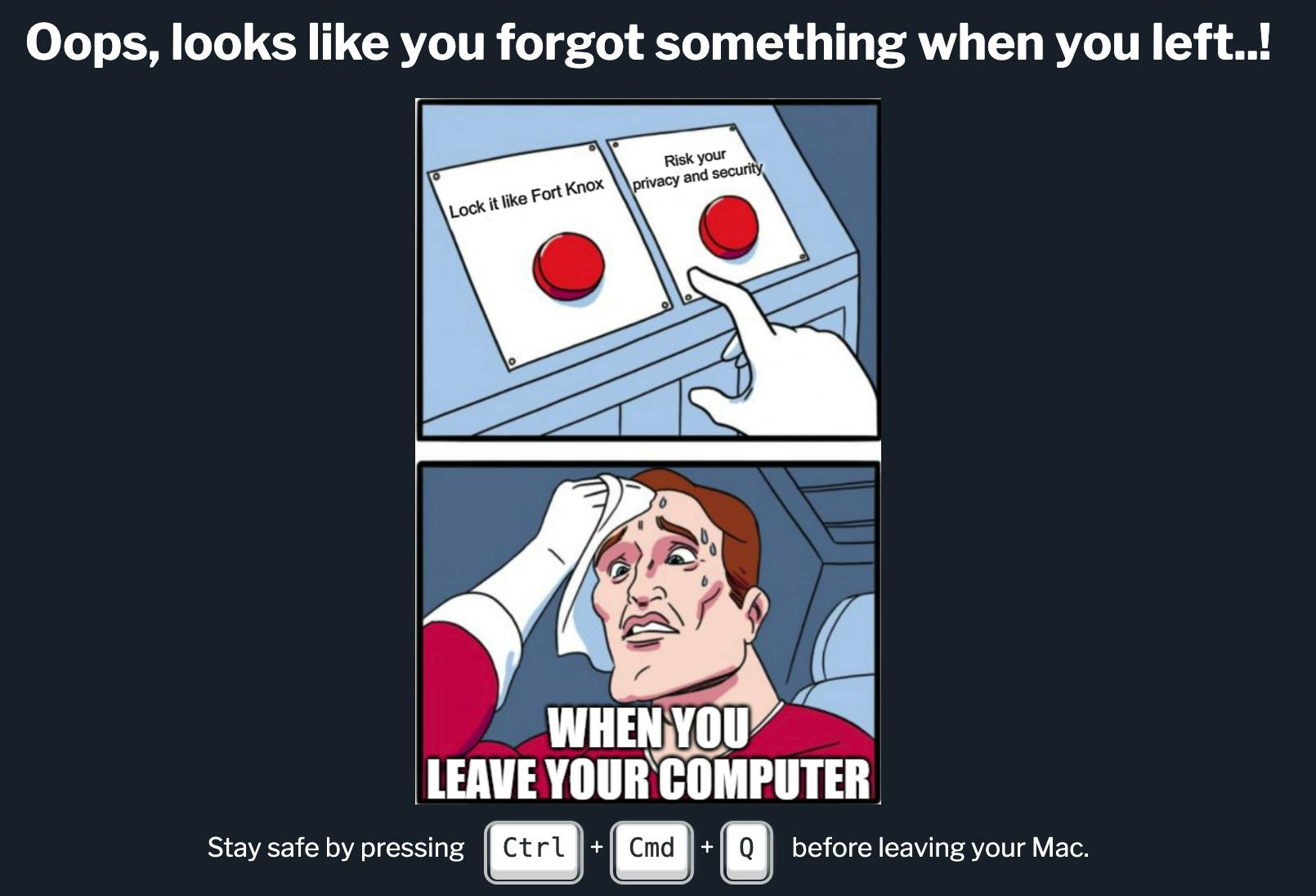 Secure Practice heeft een eenvoudige manier ontwikkeld om huisgenoten of collega’s eraan te herinneren het scherm te vergrendelen. De website laat met een vleugje humor zien hoe je de veiligheid ernstig dient te nemen. Stuur de achtergelaten computer via de browser naar https://lockmeme.com. Dan start de timer die aangeeft hoelang de computer onbeheerd is achtergelaten en tegelijk toont de site op een vrolijke manier hoe de eigenaar zijn pc wel had moeten blokkeren.