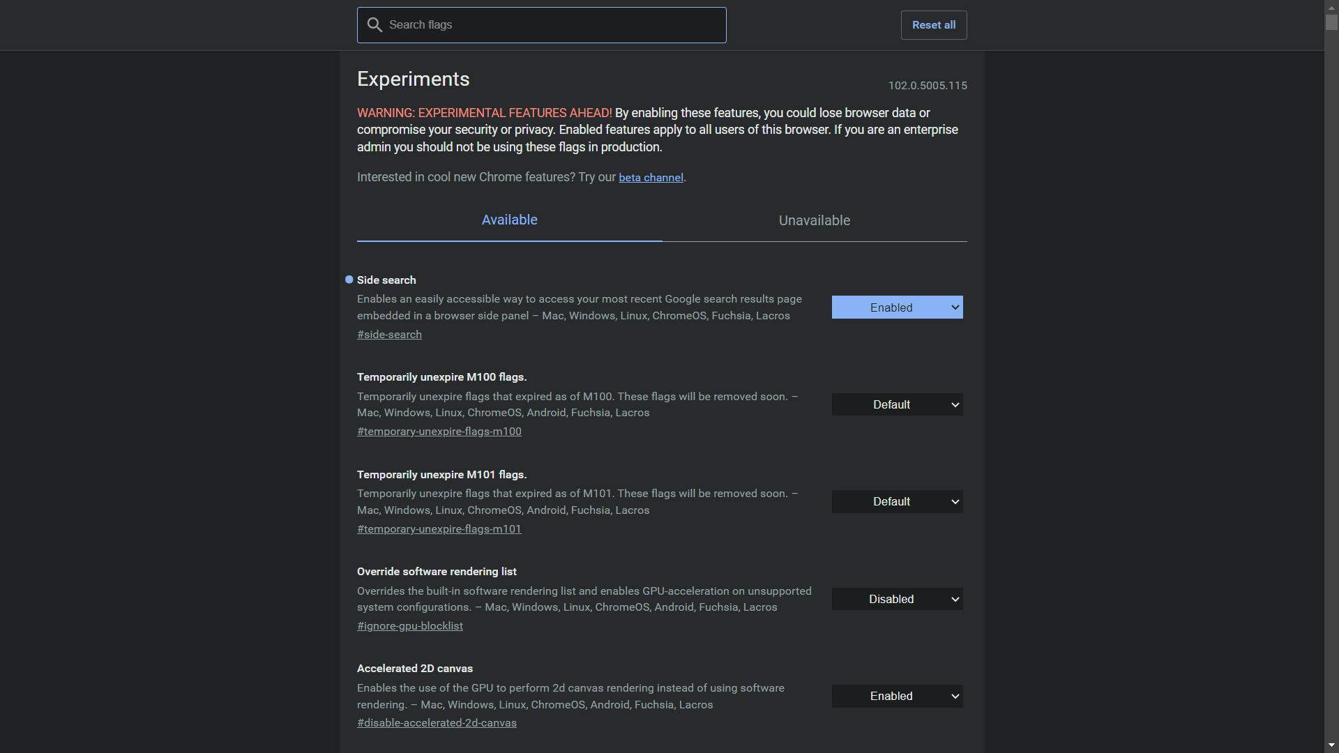 - Druk op Enter; nu zie je een lijst met experimentele functies staan