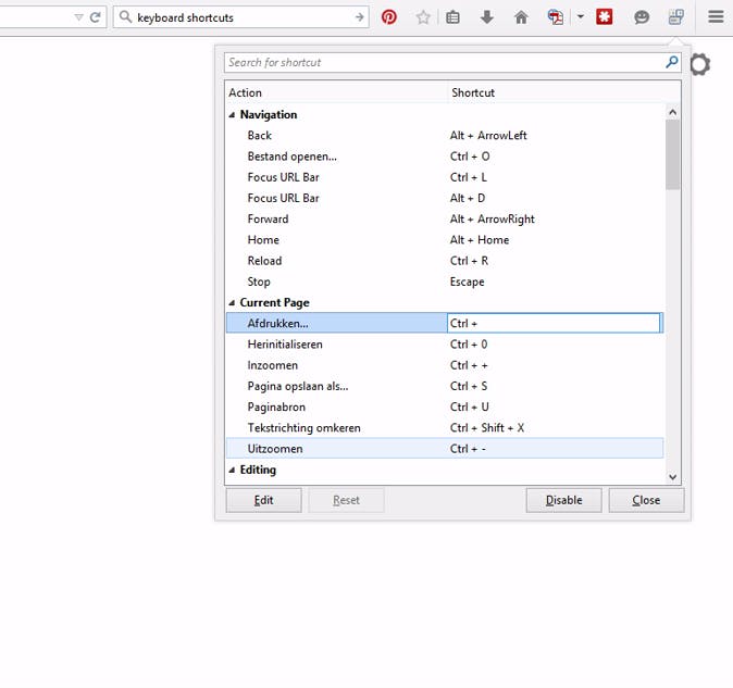 Als je besluit dat je toetsencombinatie wel handig vindt, besef dan dat je je niet hoeft neer te leggen bij de toetsencombinaties die de makers van Firefox voor je hebben bedacht. Je kunt zelf namelijk de toetsencombinaties aanpassen. Je hebt daar wel de extensie Customizable Shortcuts voor nodig. Eenmaal geïnstalleerd, verschijnt er een extra pictogram genaamd Shortcuts naast het pictogram Menu openen (de drie liggende streepjes). Wanneer je hierop klikt, krijg je niet alleen een uitgebreide lijst te zien van toetsencombinaties in Firefox, maar kun je ze óók nog eens aanpassen door op de gewenste toetsencombinatie te drukken en daarna op Bewerken. Zo kun je de browser dus écht helemaal met je toetsenbord bedienen op de manier die jij prettig vindt.