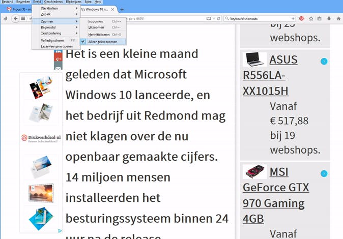 Dat je in je browser kunt zoomen hoeven we je waarschijnlijk niet te vertellen en óók daar is een toetsencombinatie voor, namelijk Ctrl + '+' (plusteken) en Ctrl + '-' (minteken). Met deze methode zoom je in op de gehele website. Maar wat als je alleen de tekst wilt vergroten en de plaatjes hetzelfde wilt houden? In dat geval klik je op Beeld > Zoomen > Alleen tekst zoomen (hiervoor moet je wel eerst de menubalk even inschakelen, wat je doet door linksboven met rechts te klikken op een leeg plekje naast de adresbalk en te klikken op Menubalk). Wanneer je Alleen tekst zoomen hebt ingeschakeld, zal alleen de tekst worden vergroot of verkleind wanneer je de zoomfunctie in Firefox gebruikt.