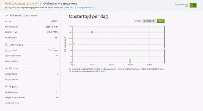 De laatste tip die we je geven helpt je niet zozeer handiger te werken met Firefox, maar kan je vooral helpen bepalen of Firefox nog wel optimaal draait. Toen een browser nog gewoon een programma was waaraan je niets kon veranderen, was er op de tijdelijke bestanden na, weinig dat de browser kon vervuilen. Inmiddels zijn browsers bijna halve besturingssystemen waarop je van alles kunt installeren (via add-ons). Dat is superhandig, maar het betekent helaas ook dat je browser na verloop van tijd zo vervuilt kan raken met code die helemaal niet in het programma thuishoort, dat het allesbehalve optimaal functioneert. Dat is met Firefox niet anders.