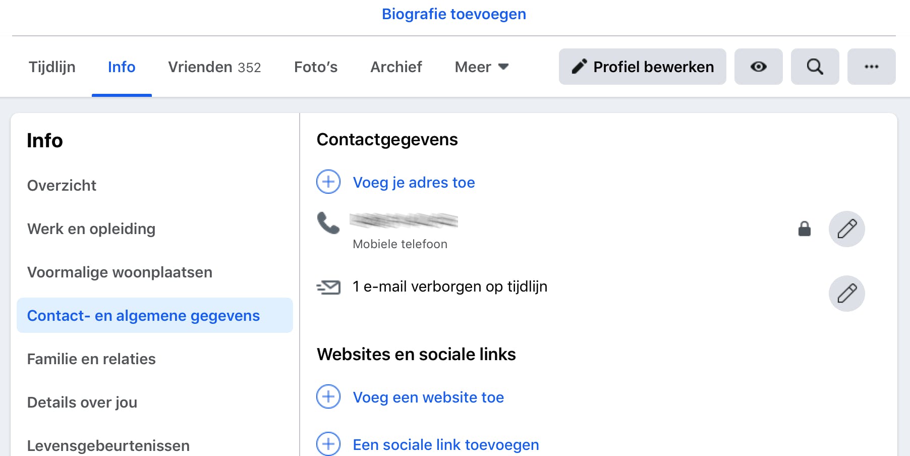 Op de computer open je eerst Facebook met je wachtwoord en gebruikersnaam. Daarna klik je op je naam bovenaan om bij je tijdlijn te komen. Klik in het menu met tabbladen op de knop Info. Op die manier verschijnt er een nieuw keuzemenu aan de linkerkant. Daar selecteer je de Contact- en algemene gegevens.