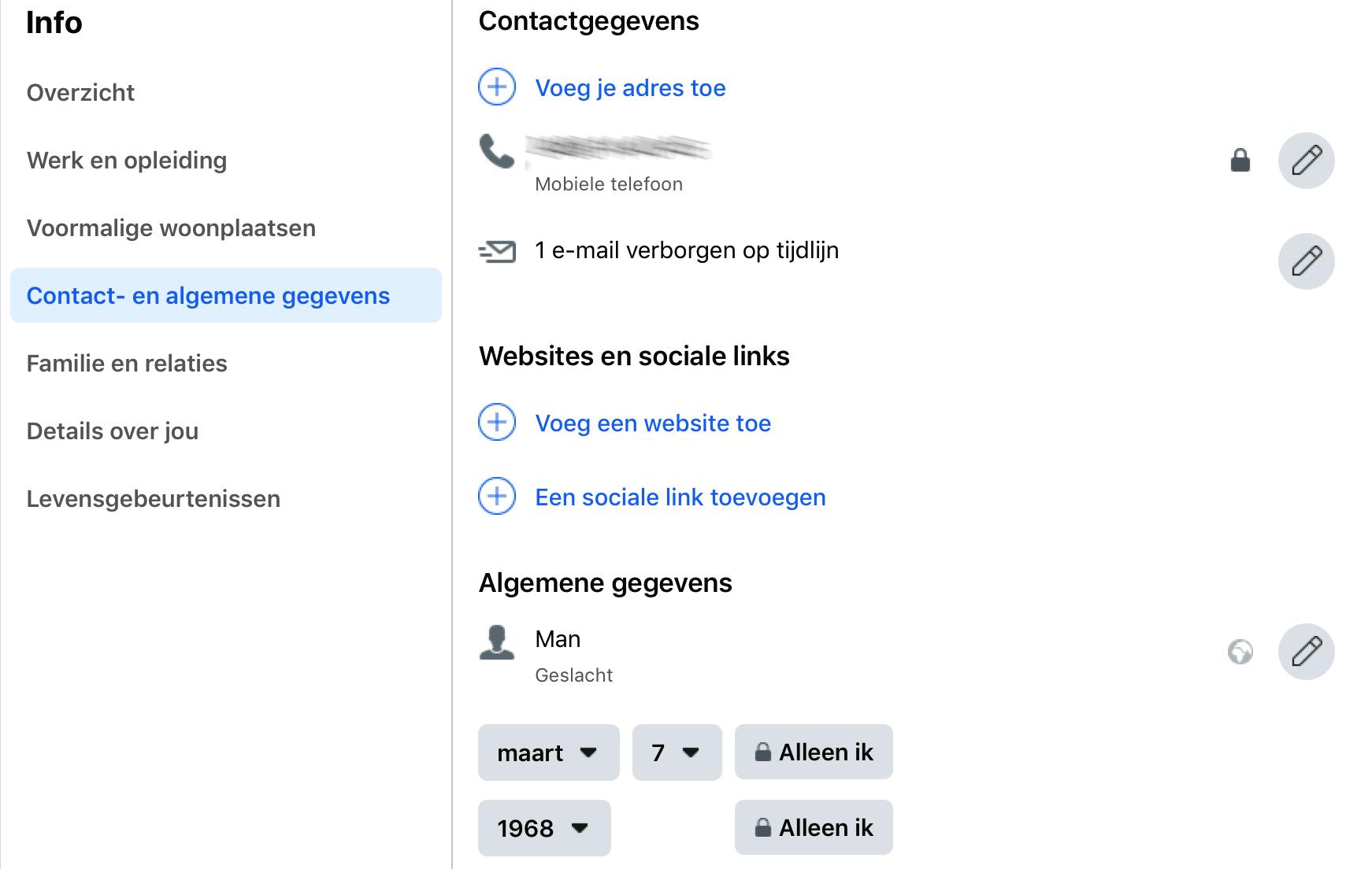 Op een smartphone is de weg iets langer. Bovendien hebben we gemerkt dat Facebook de plaats van deze functie af en toe wijzigt. Ook hier log je in op je account en ga je naar je profiel door op je naam in de bovenste werkbalk te tikken. Je scrolt naar beneden en dan gebruik je de knop Openbare informatie bewerken. Dan kom je op een scherm met je profielfoto, omslagfoto enzovoort. Helemaal onderaan staat de knop die je nodig hebt: Je info bewerken. Op die manier beland je in het venster Info waar je de groep Algemene gegevens aantreft. Tik op de knop Bewerken naast Algemene gegevens en hierdoor kun je in principe je geboortedatum en zelfs je geboortejaar aanpassen. Als je bij Geboortedatum en Geboortejaar op het slotje tikt, heb je de keuze tussen drie instellingen. Wil je dat iedereen deze gegevens kan zien, of alleen je vrienden, of mag jij alleen deze informatie lezen. Als je die derde optie selecteert, zijn die gegevens dus verborgen voor de rest van de wereld.