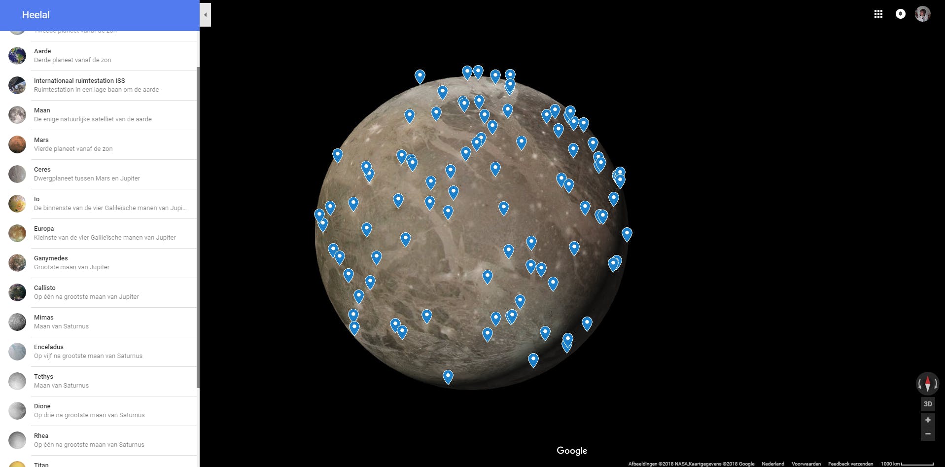 We weten hier op de redactie nog goed hoe indrukwekkend het was toen Google Earth meer dan tien jaar geleden werd uitgebracht. Google Maps heeft nog een andere verborgen functie die ons weer net zo enthousiast maakt: 3D-kaarten bekijken van planeten en manen in ons zonnestelsel. Je vindt deze optie door in Google Maps de satellietweergave te kiezen en dan net zolang (bijvoorbeeld met je muiswieltje) uit te zoomen tot je de planeet Aarde ziet vanuit de ruimte. Aan de linkerkant van je venster verschijnt dan automatisch een menu met alle planeten en een flink aantal manen. Dat zijn ze overigens niet allemaal - Jupiter heeft bijvoorbeeld tientallen minimaantjes, maar die zijn niet allemaal in maps gecategoriseerd. De grote en belangrijke manen staan hier allemaal wel in, inclusief beschrijvingen. Het leuke is dat van deze planeten niet alleen gedetailleerde kaarten te vinden zijn, maar dat je ook de namen van kraters en bergen kunt zien. Daar kun je vervolgens op klikken om er wat meer informatie over te lezen, zoals de grootte of waar ze naar vernoemd zijn.