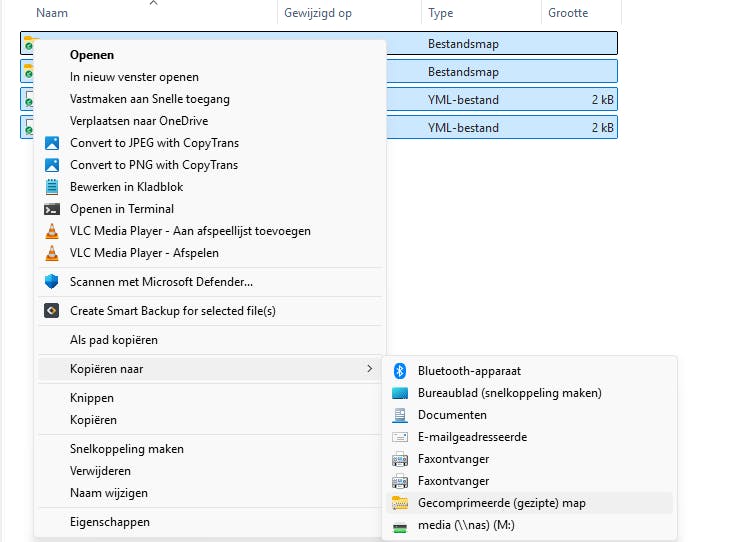 In Windows kun je al langer bestanden en mappen archiveren naar een zip-bestand. Selecteer de items, klik met rechts op de selectie en kies Kopiëren naar / Gecomprimeerde (gezipte) map. Het zip-bestand neemt automatisch de naam over van het bestand waarop je het laatst hebt geklikt.