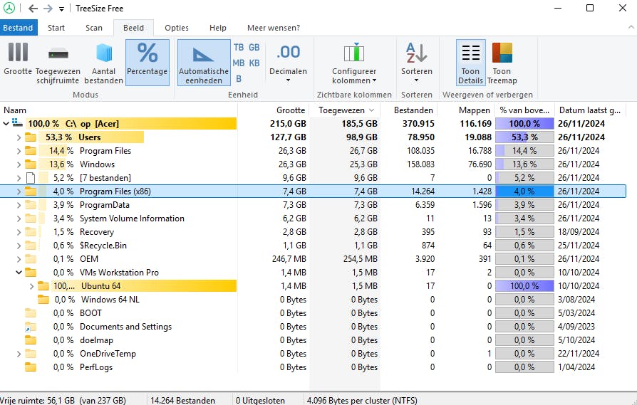 Verkenner geeft een beetje inzicht in de beschikbare schijfruimte, maar het is minder snel duidelijk waar de grootste bestanden zich bevinden. Hiervoor is een tool als TreeSize Free handiger. Deze tool toont in een boomstructuur welke mappen en bestanden de meeste ruimte innemen, inclusief hun percentage van de totale schijfruimte.
