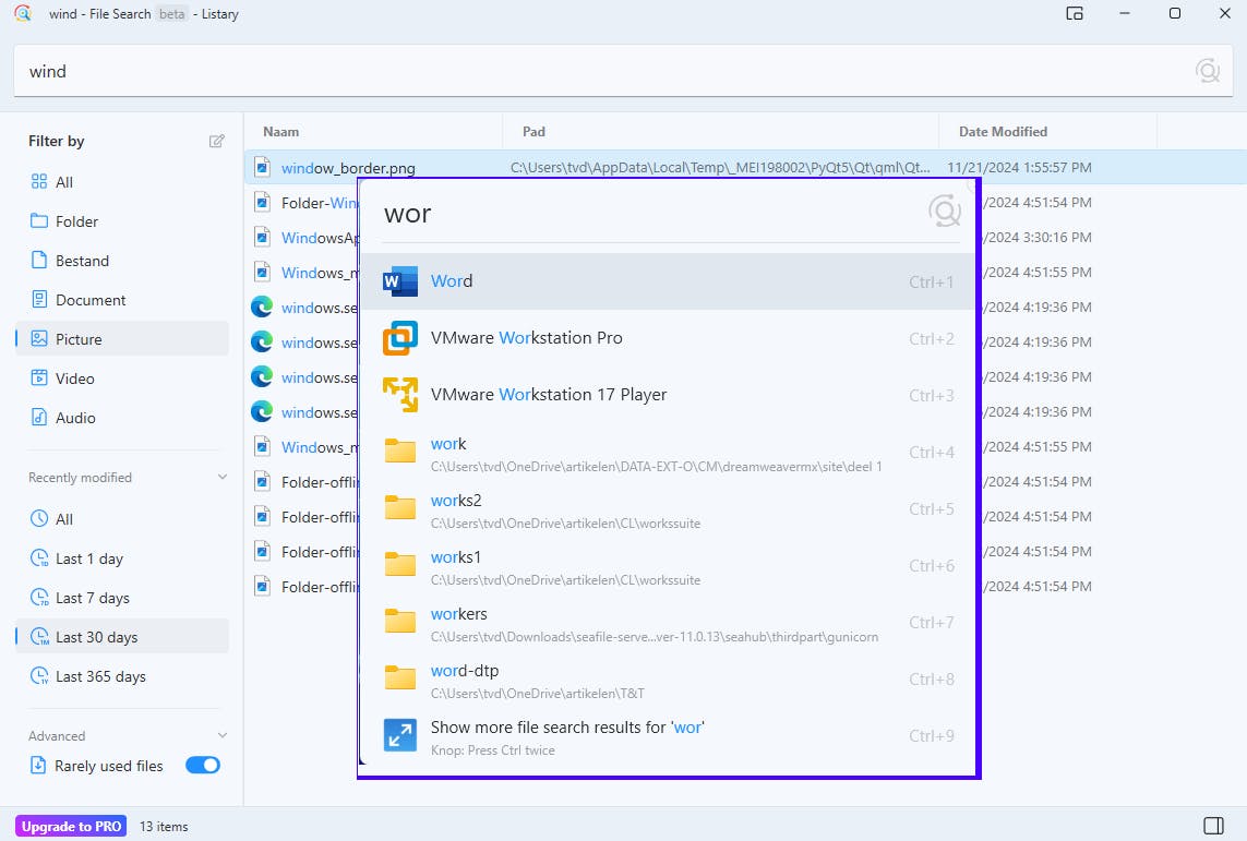 Standaard zoekt Listary op alle lokale schijven (aanpasbaar in de Pro-versie, inclusief ondersteuning voor netwerkschijven). Standaardfilters als Folder, Bestand, Document, Picture, Video en Audio helpen je resultaten te verfijnen, en je kunt instellen hoe recent data mogen zijn gewijzigd.