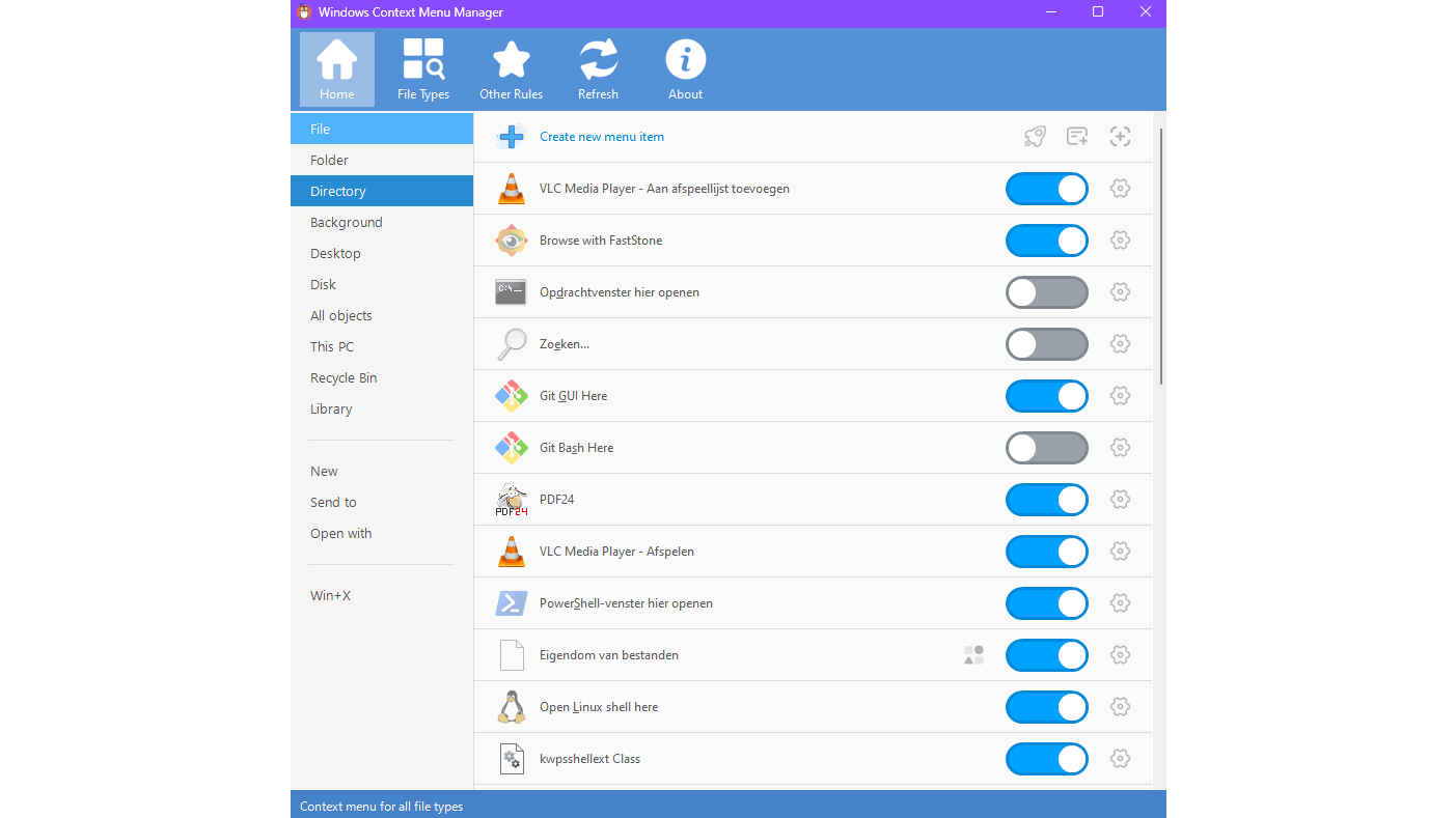Voorbeelden zijn Change Icon, Size of Folder, Send to Mail Recipient en Shred Files. Via Configure Filemenu Tools kun je het menu aanpassen door ongewenste items uit te schakelen en dit te bevestigen met de groene V-knop. Op de tabbladen Send To… menu en Commands of other applications kun je ook andere contextmenu-opties aanpassen, maar voor volledig beheer van het contextmenu is Context Menu Manager beter geschikt. Klik op de GitHub-pagina op Github Releases en download het recentste exe-bestand. In het menu Home kun je vrijwel alle contextmenu-opties van Verkenner beheren, ongewenste items uitschakelen en eigen items toevoegen via Create new menu item.