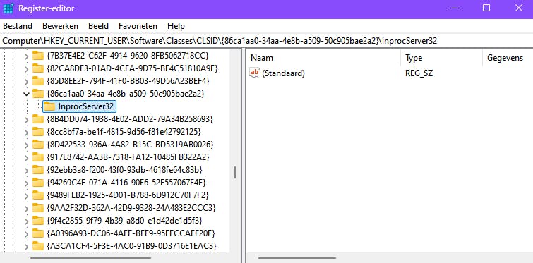 Start regedit.exe vanuit het Windows-startmenu. Navigeer naar de sleutel HKEY_CURRENT_USER\Software\Classes\CLSID. Klik hier met rechts op en kies Nieuw / Sleutel. Geef deze de naam {86ca1aa0-34aa-4e8b-a509-50c905bae2a2}. Klik met rechts op deze nieuwe sleutel en maak hier de subsleutel InprocServer32. Dubbelklik in het rechterdeelvenster op (Standaard), bevestig met OK, sluit De Register-editor af en herstart Windows.