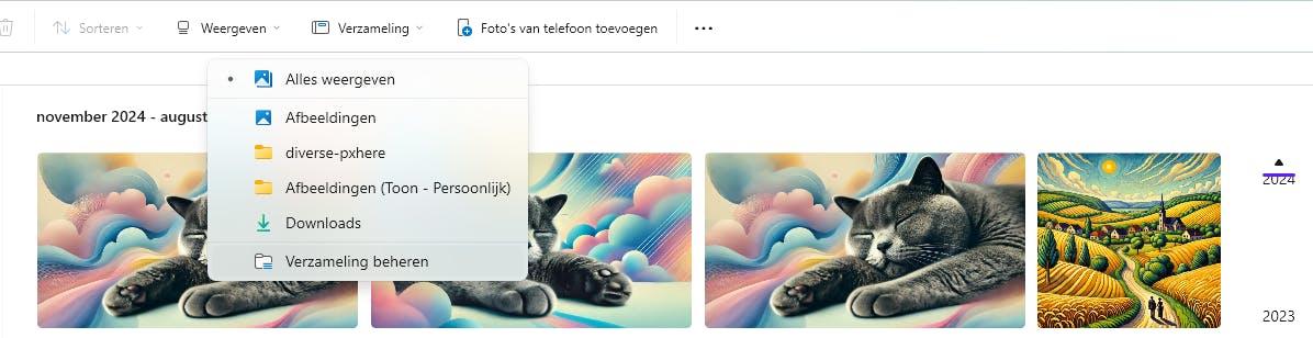 Op de startpagina van Verkenner vind je in het navigatiedeelvenster, direct onder Thuis, de rubriek Galerie. Hier zie je een chronologisch overzicht met een scrolbare tijdsindeling van visuele media uit je persoonlijke mappen Afbeeldingen en Video’s, en uit je OneDrive (indien synchronisatie is ingeschakeld).