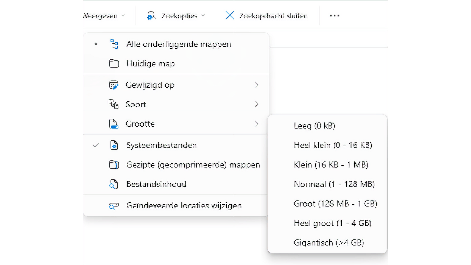Via de optie Zoekopties bovenaan, kun je na het invoeren van een zoekterm allerlei filters instellen, zoals Gewijzigd op / Deze maand en Grootte / Heel groot. Hier kun je ook locaties en criteria kiezen, zoals Alle onderliggende mappen of Huidige map, al dan niet ook zoeken in de (leesbare) bestandsinhoud enzovoort.