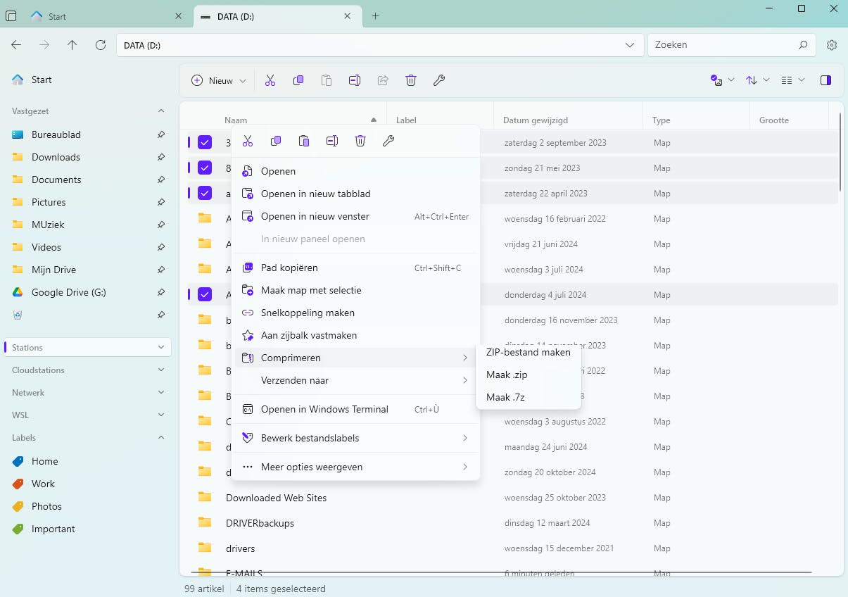 Met Labels kun je gekleurde labels toewijzen aan data, waarna deze automatisch in virtuele mappen verschijnen. Klik op het icoon naast een map of bestand om deze te veranderen in selectievakjes, wat meervoudige selectie vereenvoudigt. Het contextmenu biedt opties zoals Comprimeren (naar zip en 7z) en de optie Maak map met selectie. Ook hernoemen in bulk is mogelijk. Via het tandwielpictogram zet je de interface nog meer naar je hand.