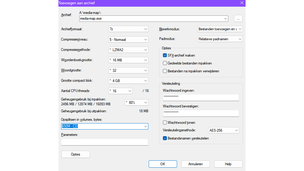 Je kiest bijvoorbeeld het archiefformaat (7z, zip, tar, wim enzovoort), compressieniveau en -grootte. Ook kun je een zelfuitpakkend SFX-archief maken (met exe-extensie) of het archief beveiligen met een wachtwoord. Daarnaast is het mogelijk grote archieven automatisch op te splitsen in instelbare, kleinere bestanden.