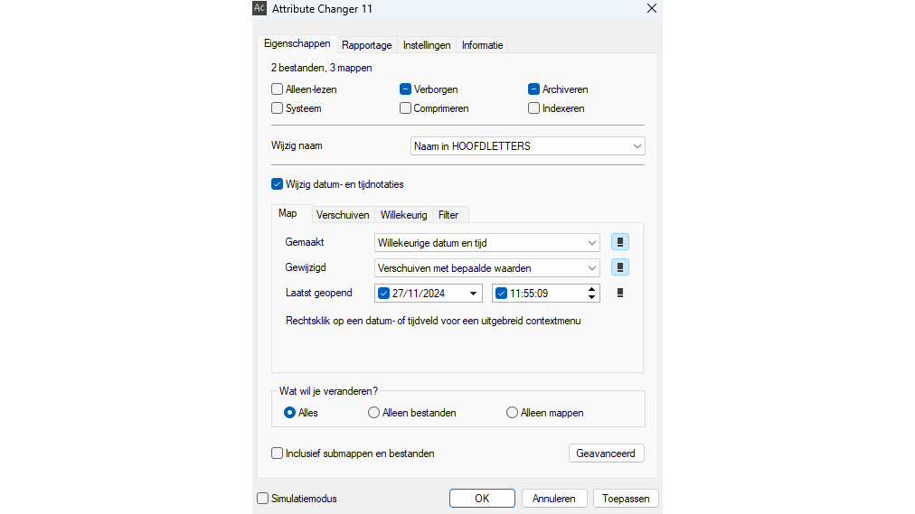 Selecteer de gewenste data in Verkenner, open het contextmenu en kies Eigenschappen aanpassen. Op het tabblad Eigenschappen schakel je attributen naar wens in of uit, en pas je tegelijk de datum- en tijdnotaties aan (Gemaakt, Gewijzigd, Laatst geopend). Rechtsklikken op de velden geeft toegang tot extra opties. Zo kun je bijvoorbeeld de datum van een (foto)selectie in één keer met een bepaald aantal dagen aanpassen. Een simulatiemodus toont de wijzigingen vooraf.