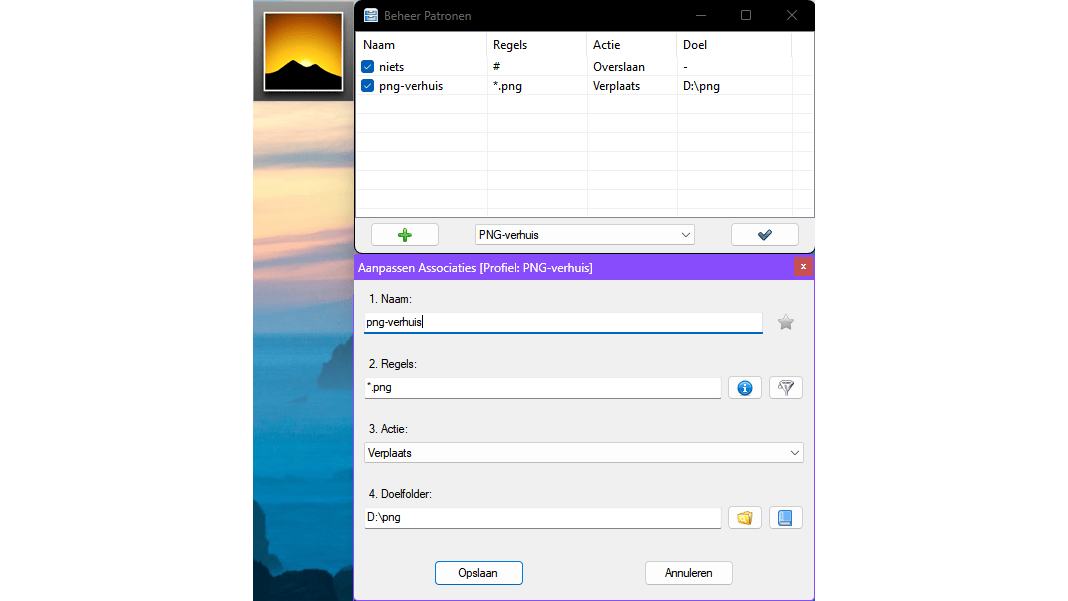 Wil je bijvoorbeeld alle png-bestanden uit een map verplaatsen, geef het profiel dan een naam als PNG-verhuis. Selecteer vervolgens een pictogram via Zoeken en sla het profiel op. Kies het profiel, klik met rechts op het pictogram en ga naar Associaties. Klik op de plusknop, vul een naam in en stel bij Regels de waarde *.png in. Kies Verplaats bij Acties (DropIt ondersteunt meer dan twintig verschillende acties) en geef de Doelfolder op. Voeg een extra associatie toe voor andere bestanden: Regels: # (voor alle andere bestanden), Actie: Overslaan. Bewaar de associaties. Nu kun je een map met png-bestanden simpelweg naar de DropIt-knop slepen en bevestigen.