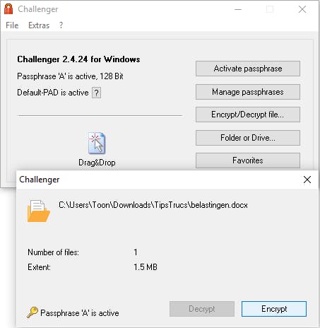 Start je de tool de eerste keer op, dan vul je in het veld Enter start-password standaard Berlin in. Bevestig met OK en laat de andere opties voor wat ze zijn. Vervolgens druk je op de knop Manage passphrases, selecteer je Channel A – Masterphrase en klik je op New, waarna je twee keer een stevig wachtwoord invult. Bevestig met OK / Close. Je komt terug in het hoofdvenster waar je de knop Activate passhprase indrukt en twee keer het wachtwoord invult dat je zonet bij A - Masterphrase hebt opgegeven. Je kunt nu een of meer bestanden, maar ook een complete map naar het pictogram Drag&Drop verslepen, waarna je de bestandsselectie met Encrypt versleutelt.