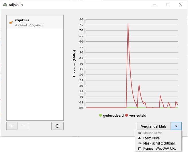 De locatie van je kluis is ook via WebDAV beschikbaar: selecteer de kluis, klik op het pijltje naast Vergrendel kluis en kies Kopieer WebDAV URL. Deze url kun je vervolgens in Verkenner plakken. Dat wordt iets als http://localhost:42427/<naam_van_kluis>. Via het tandwielpictogram, onderaan het kluisoverzicht, kun je het poortnummer aanpassen.